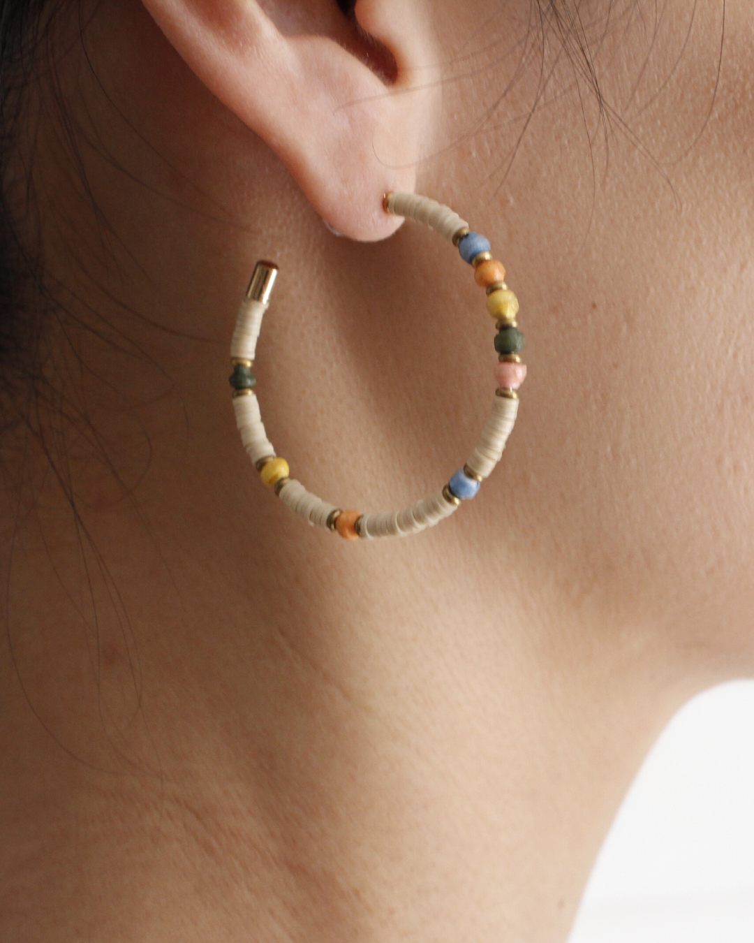 色とりどりの組み合わせが印象的な、手編みのピアスでスタイルにアクセントを。