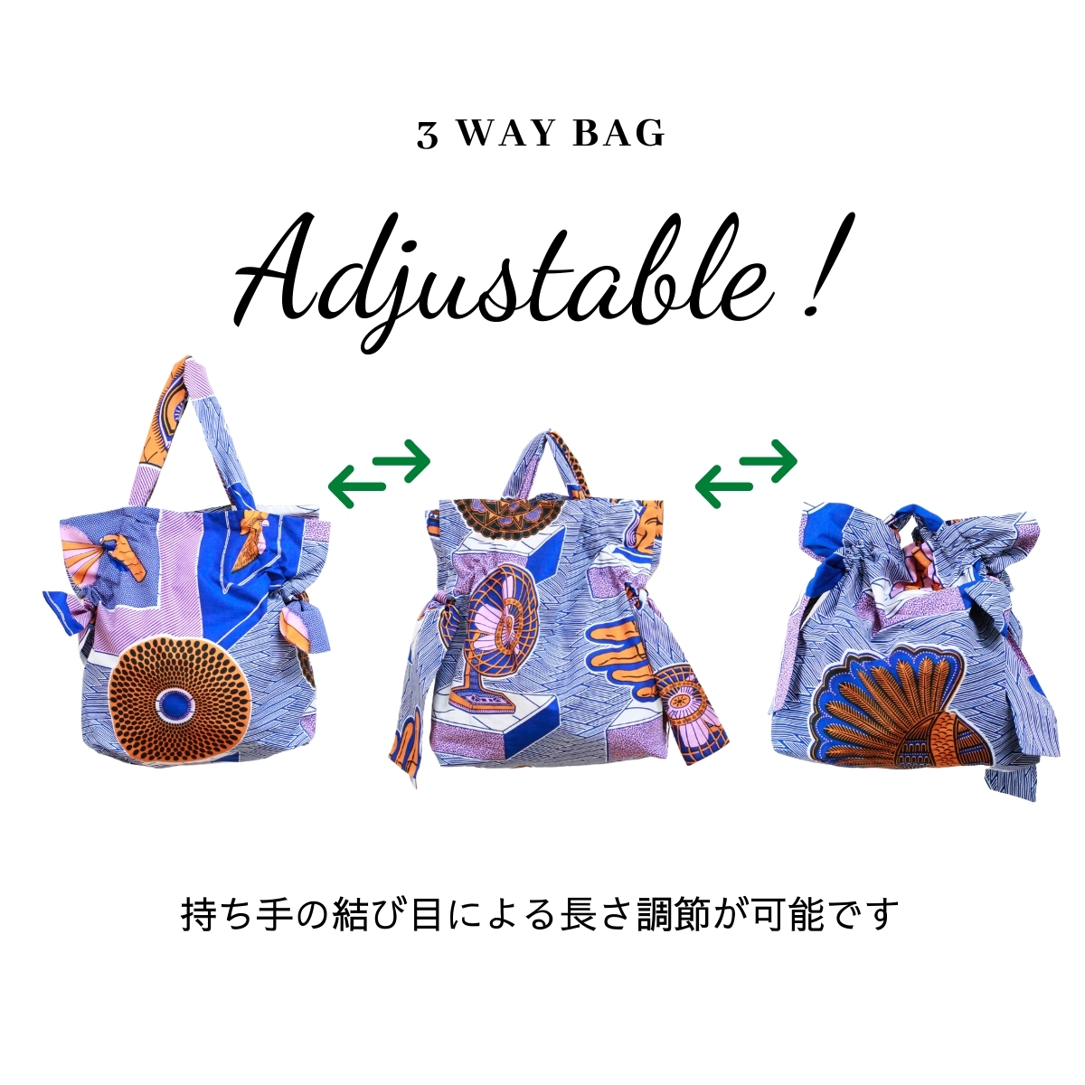 This is also a functional bag which allows the length of the handles to be adjusted by tying knots on the both sides.