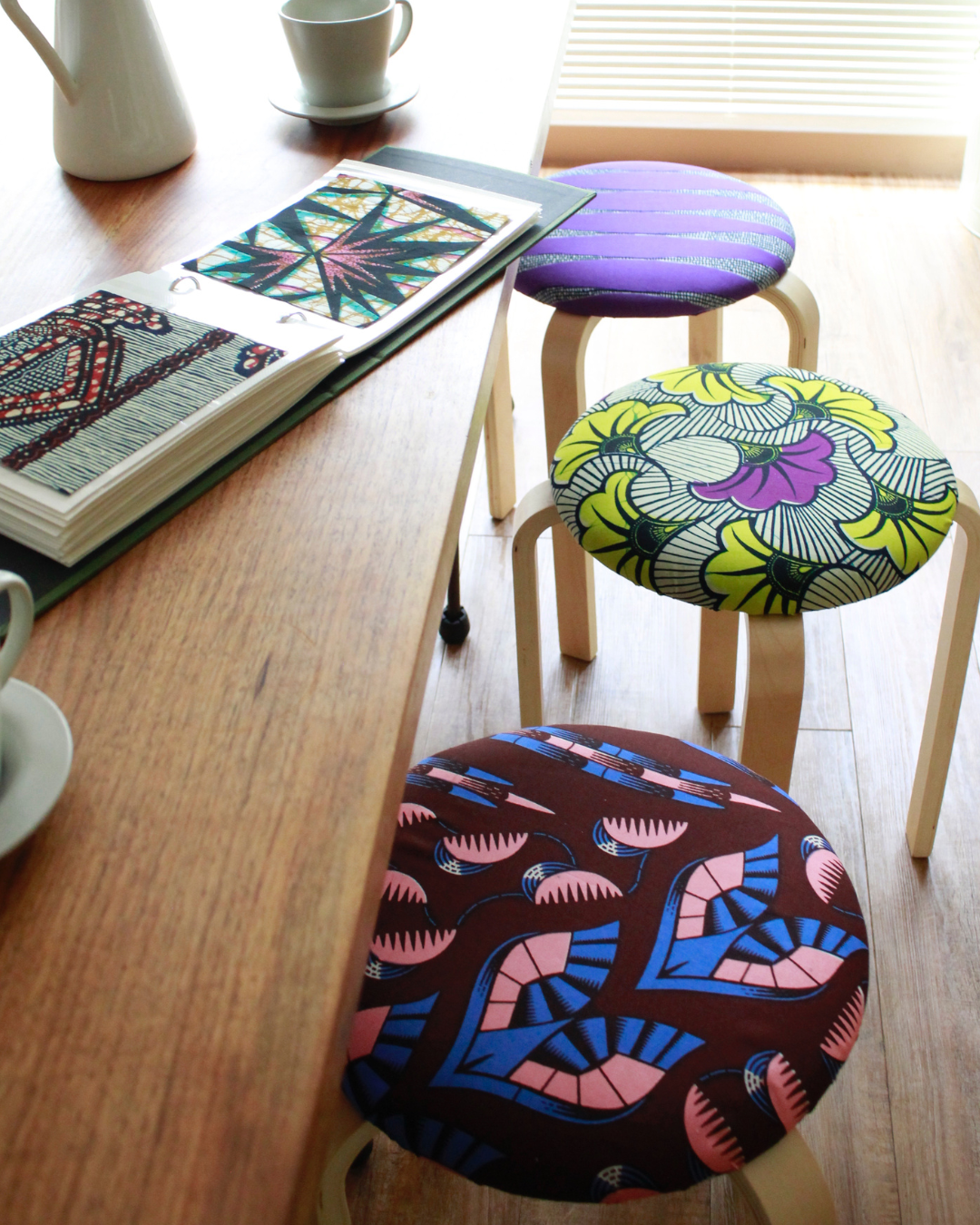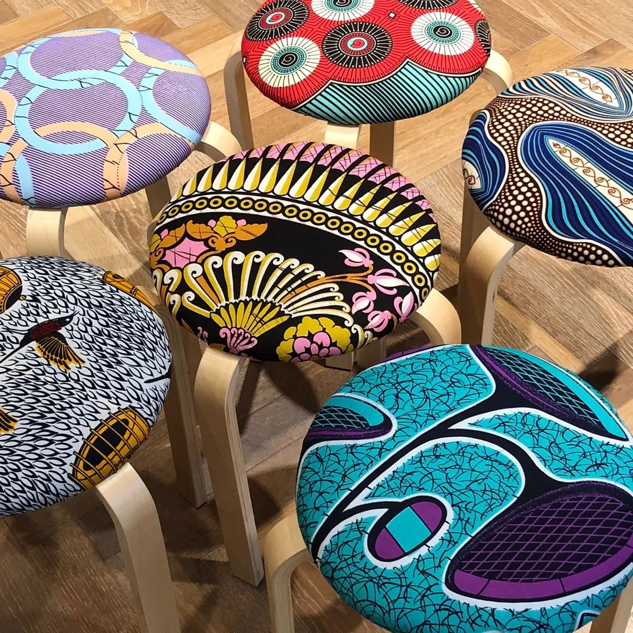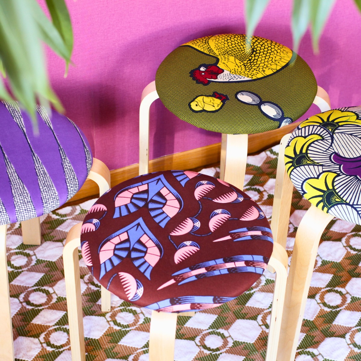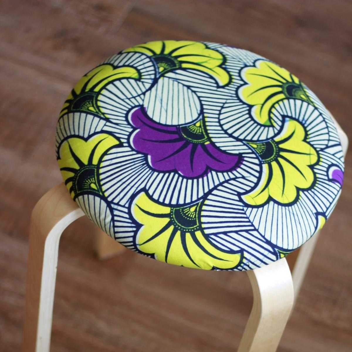 プレイフルなインテリアはお部屋の雰囲気をグッと変えてくれること間違いなし!スツールは裏側もスッキリ綺麗に仕上げ、SAWASAWAならではのハンドメイドのコツやこだわりをお伝えします。しかも!使用する生地は店頭に並んでいるワックスプリントの中から、お好きな生地(⋆)をお選びいただけます。