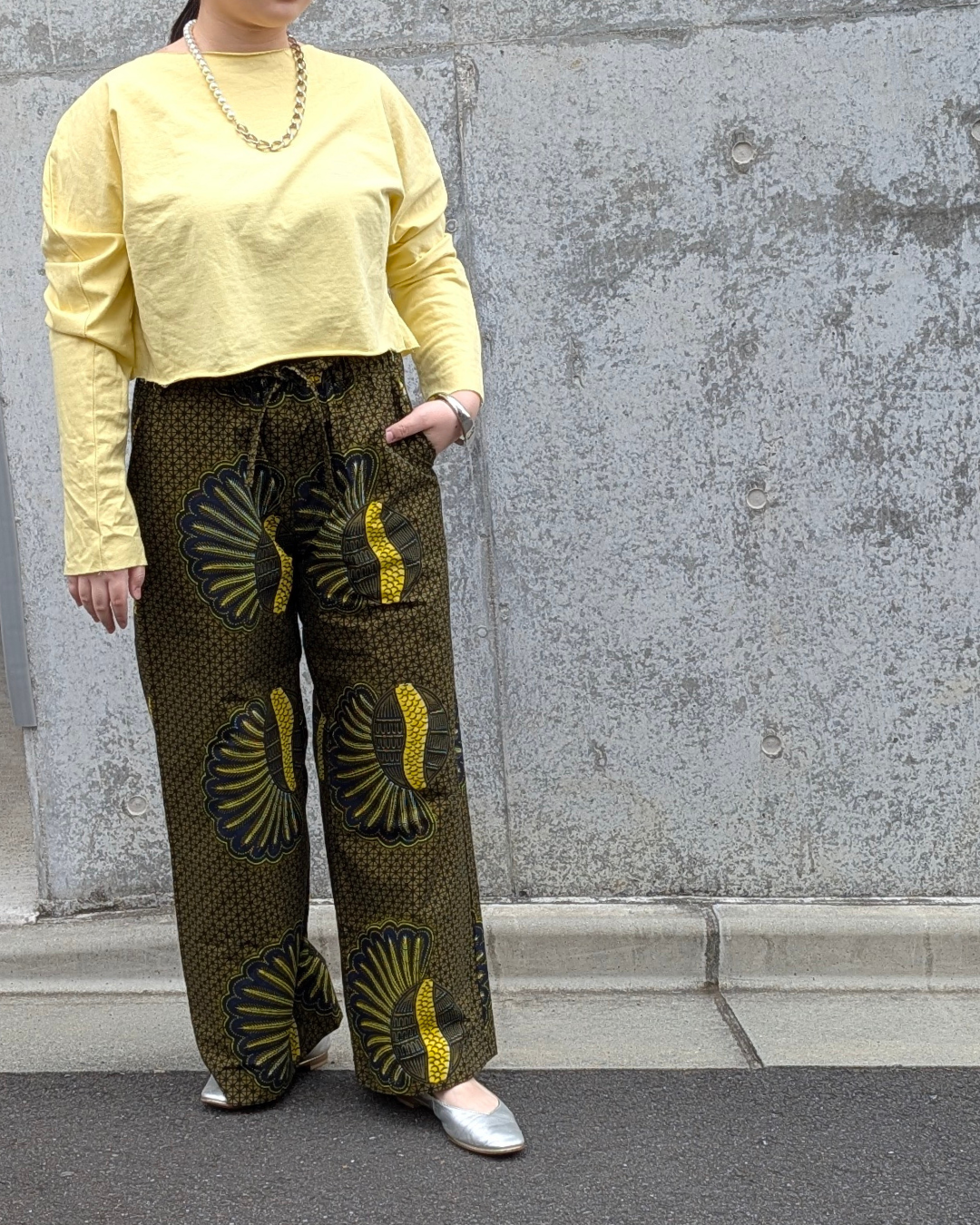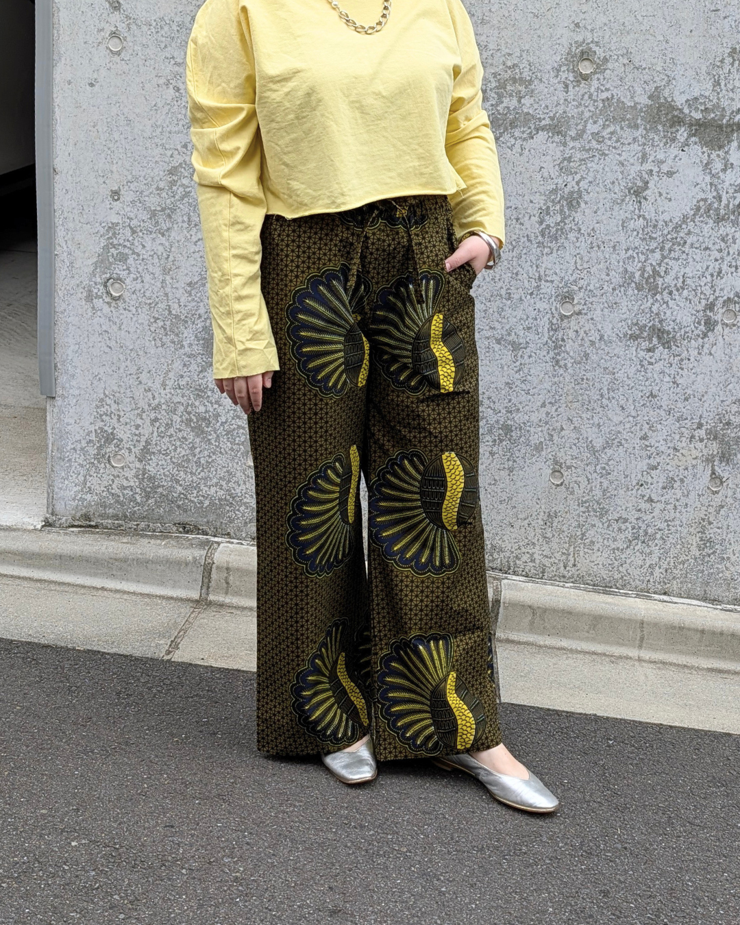 SAWASAWAのストレートパンツは、ワックスプリント生地の張りを生かしたこだわりのシルエット。ゆったりした着心地はもちろん、裾が広がらないボリューム感が大人っぽい雰囲気でスタイリング全体をグッと上品にしてくれます。すっきりとしたシルエットなのでスニーカーにもパンプスにもブーツにも合わせやすいパンツです。