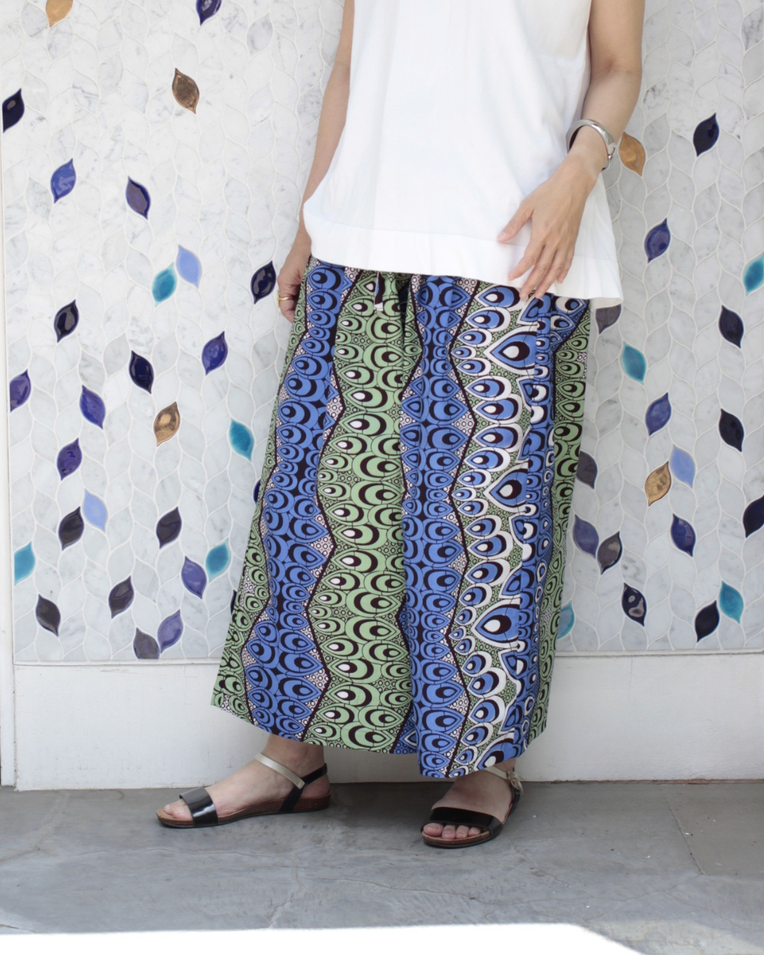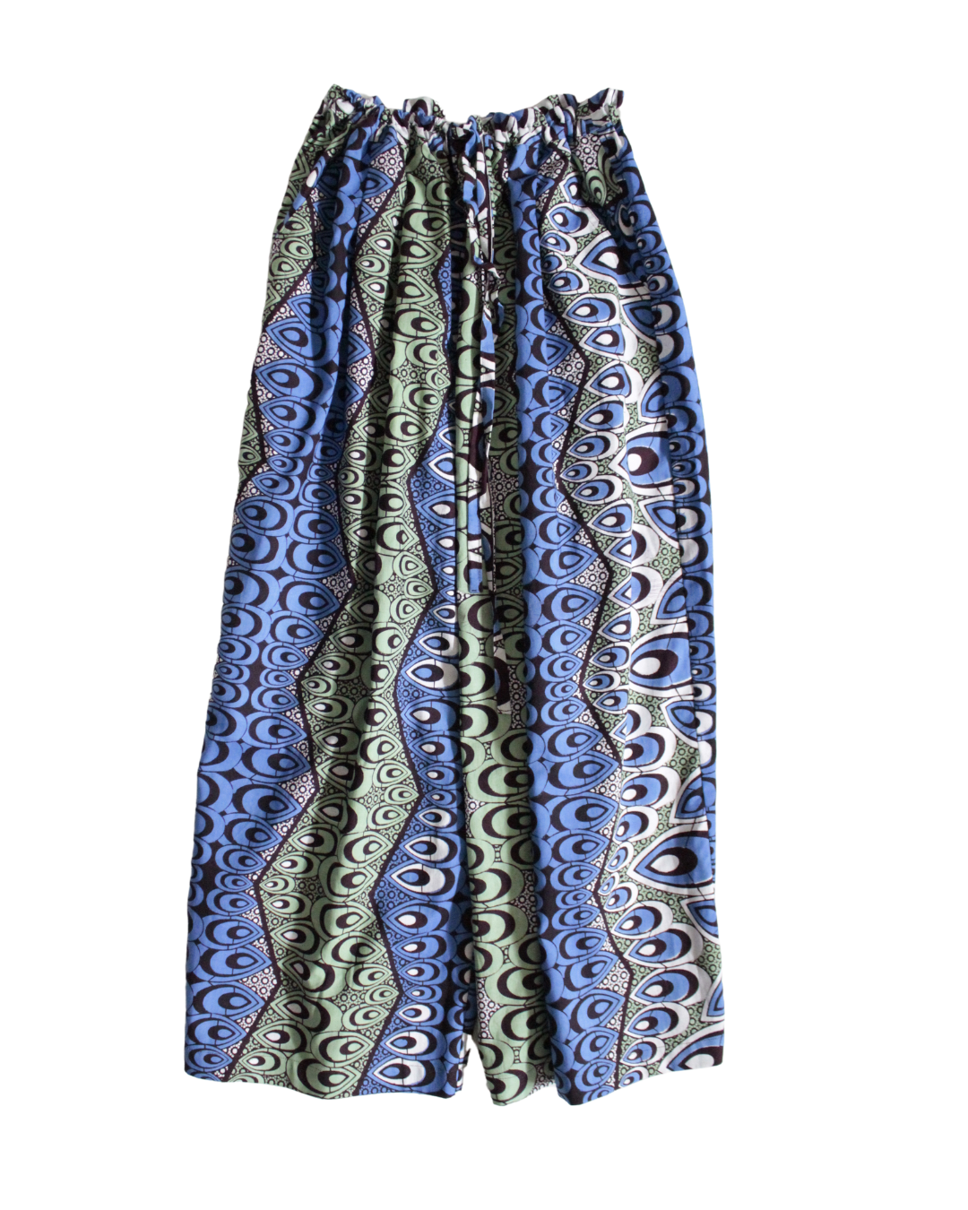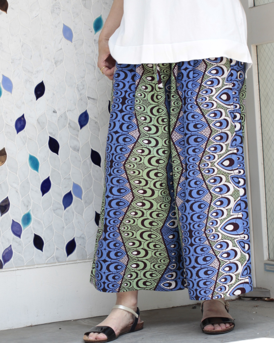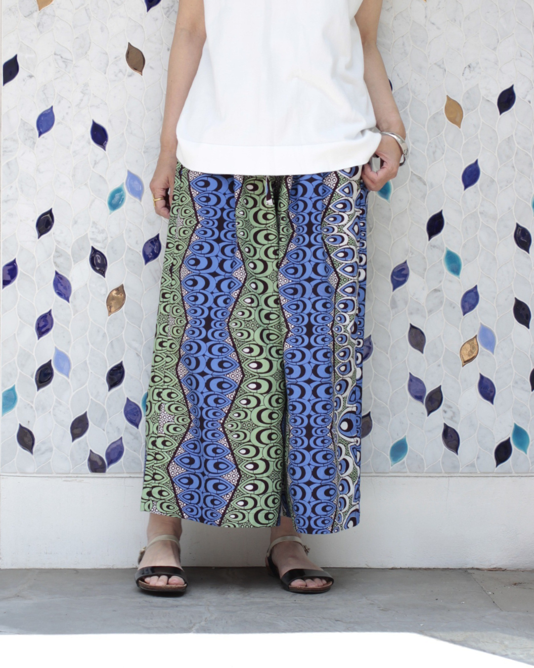 ウエストが総ゴム仕様なのでリラックスした着心地をお楽しみいただけます。また、共布の紐で結ぶことでサイズ調節していただけます。