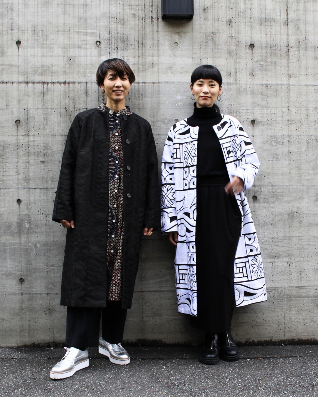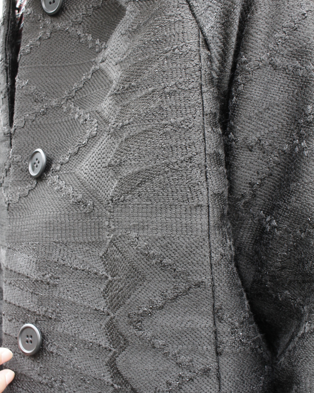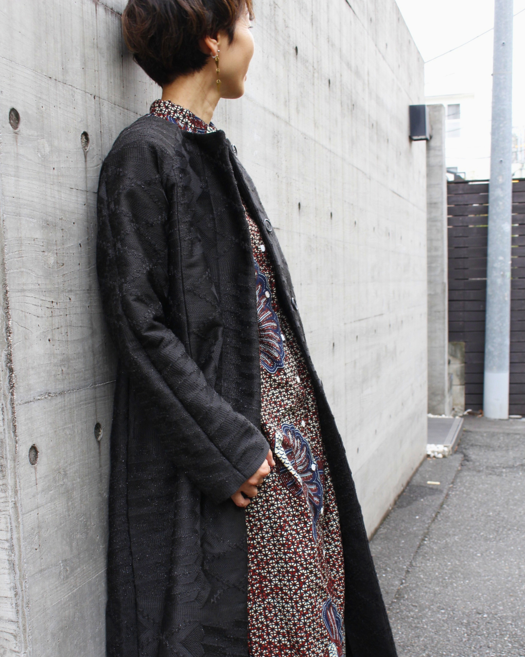 生地そのものが持つ歴史と色柄の個性を活かし、裁断はゆったりとしたラグランスリーブに。肩まわりがすっきり見えるよう設計しながら、身にまとうと自然にドラマを生む佇まいに仕上げました。インナーを選ばず羽織としても、ボタンを留めてワンピースのようにも使える—そんな自由な着方ができる一着です。