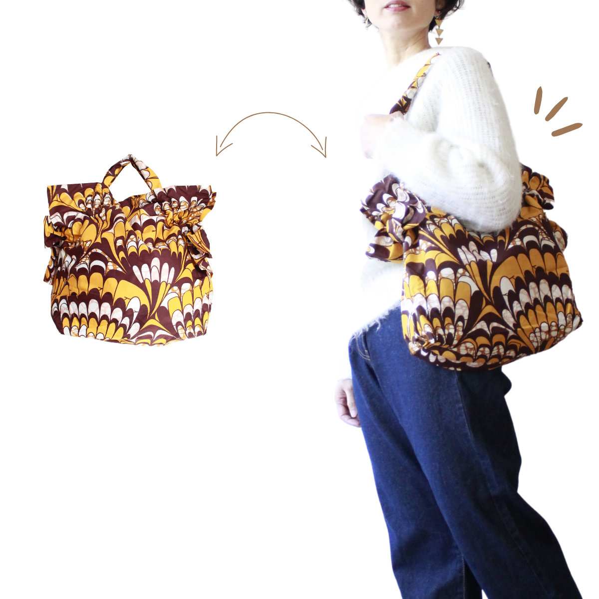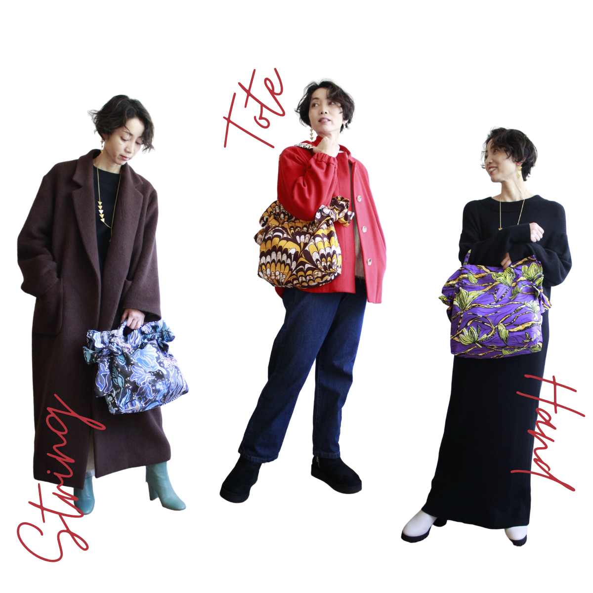 This is also a functional bag which allows the length of the handles to be adjusted by tying knots on the both sides.