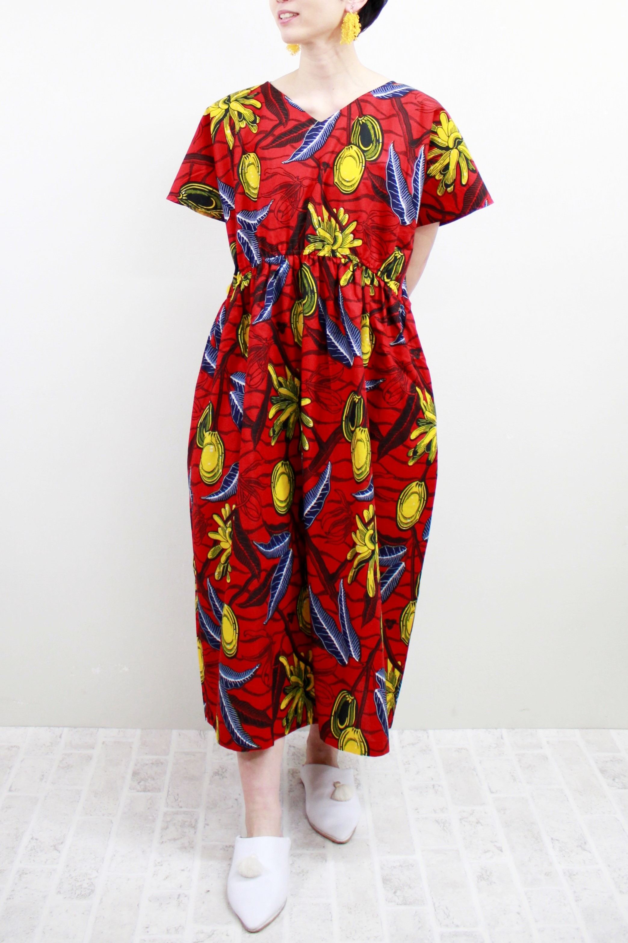 きいろの実柄 Vネックロングワンピース