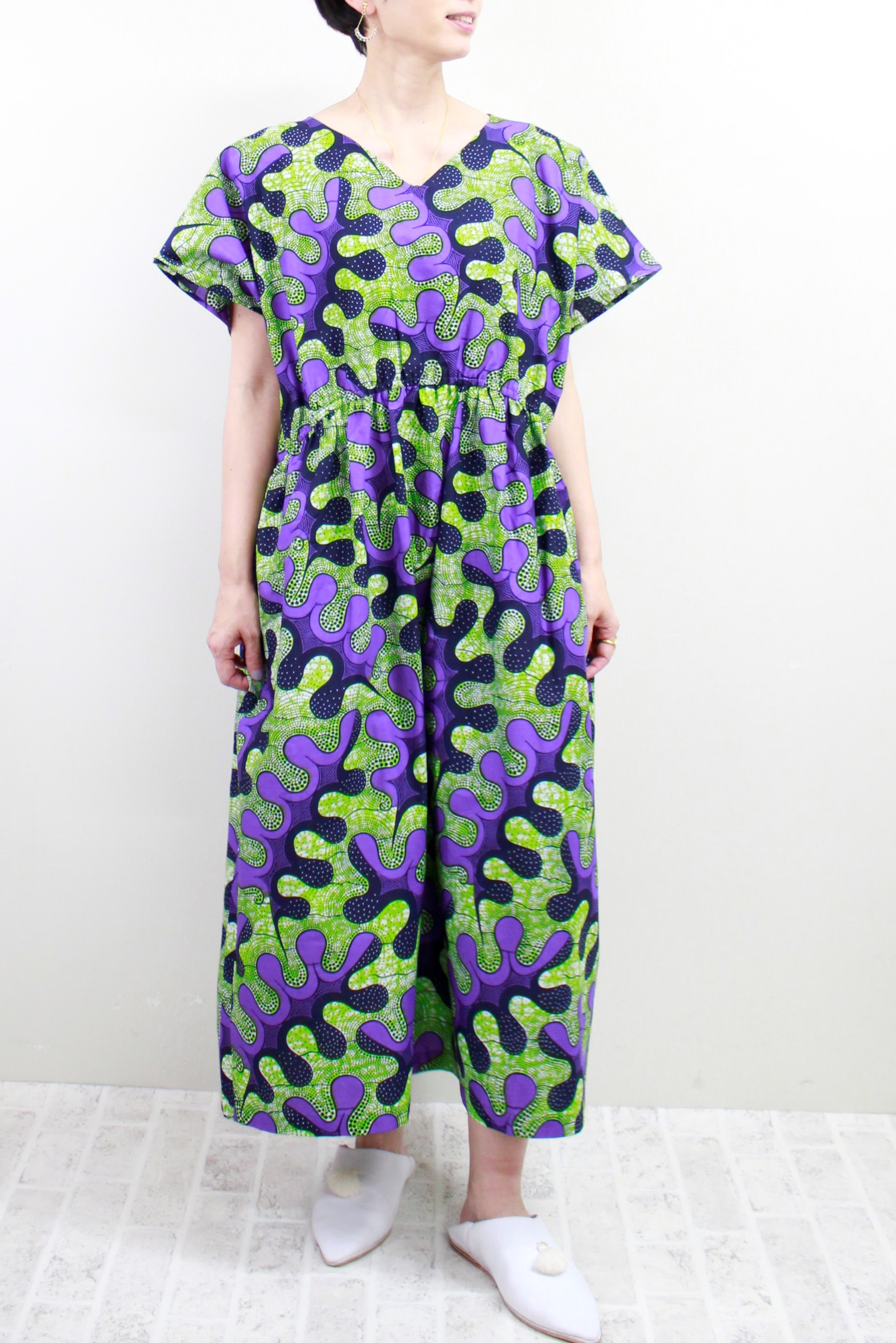 恵みの雨柄Vネックロングワンピース