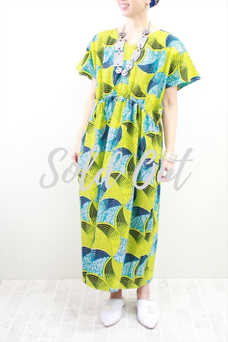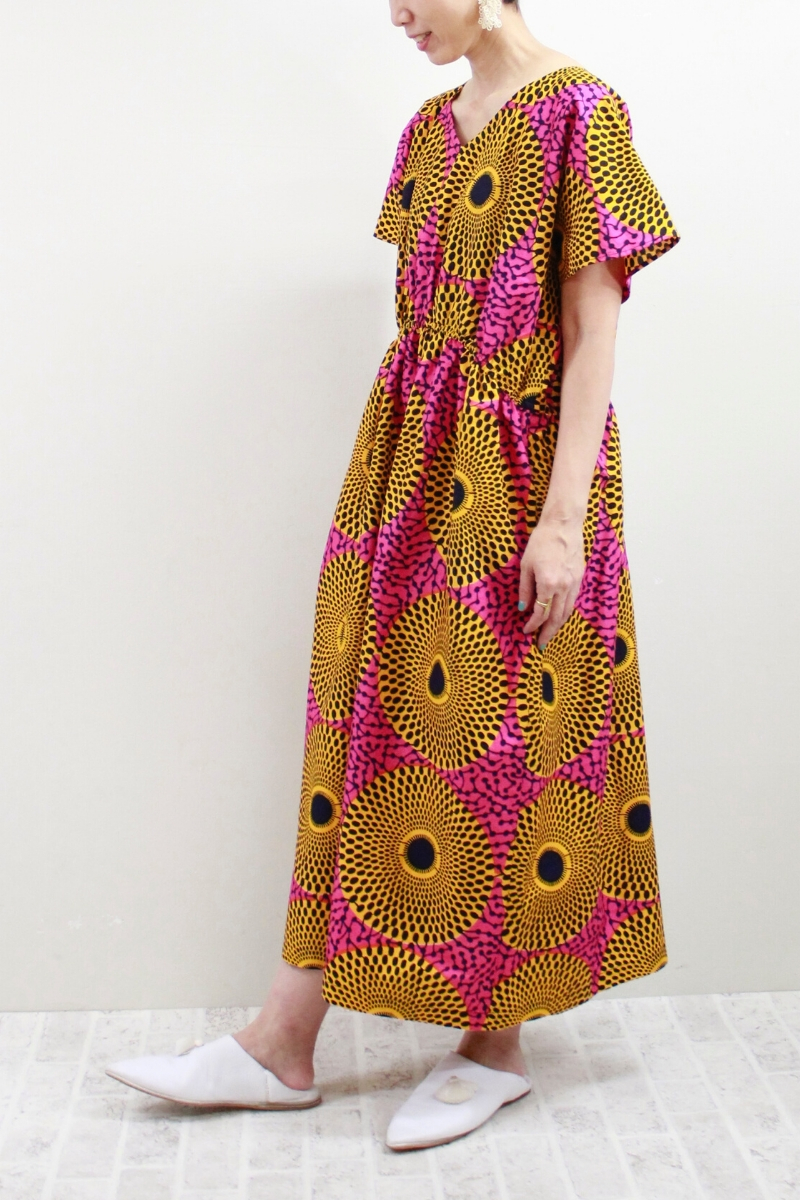 サークル柄(ピンクイエロー)柄Vネックロングワンピース